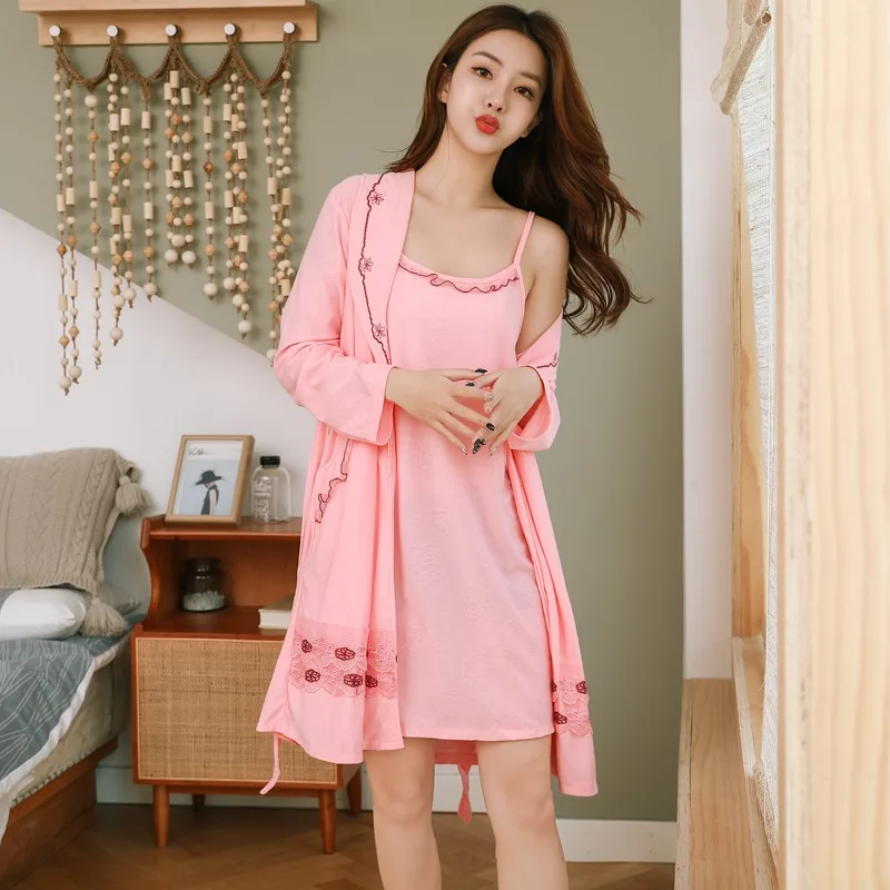 Best Product 2PCS Sexy Cotton Print Nightgowns Robes Sets for Women 2019 Autumn Long Sleeve Night Mini Dress Sle