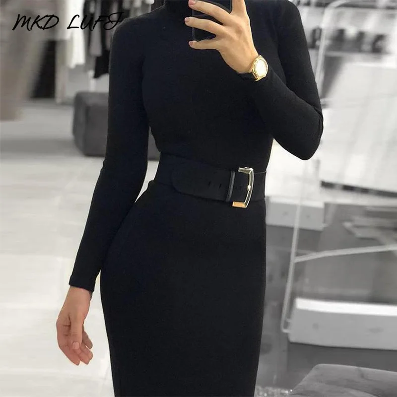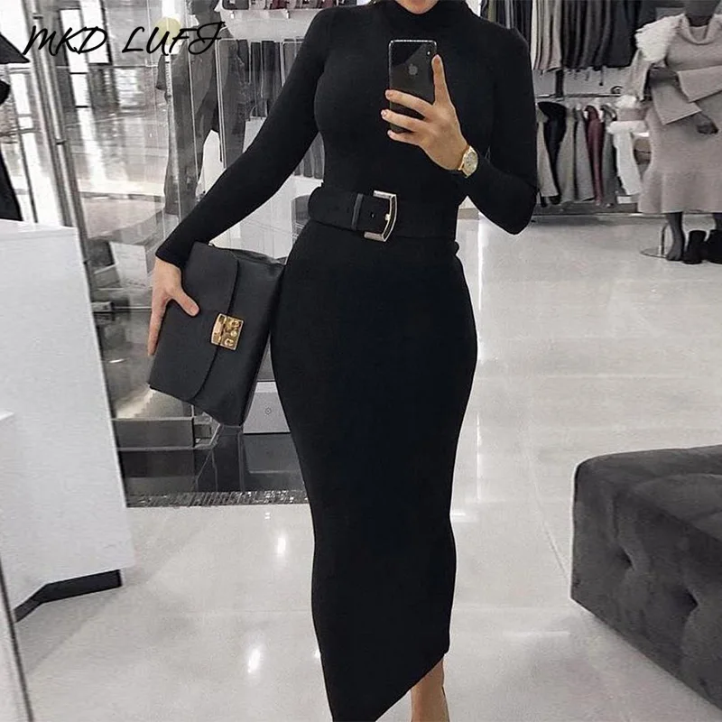 Good Product High Neck Long Sleeve Slinky Midi Dress Women Elegant Solid Skinny Bodycon Party Dress (Without Bel